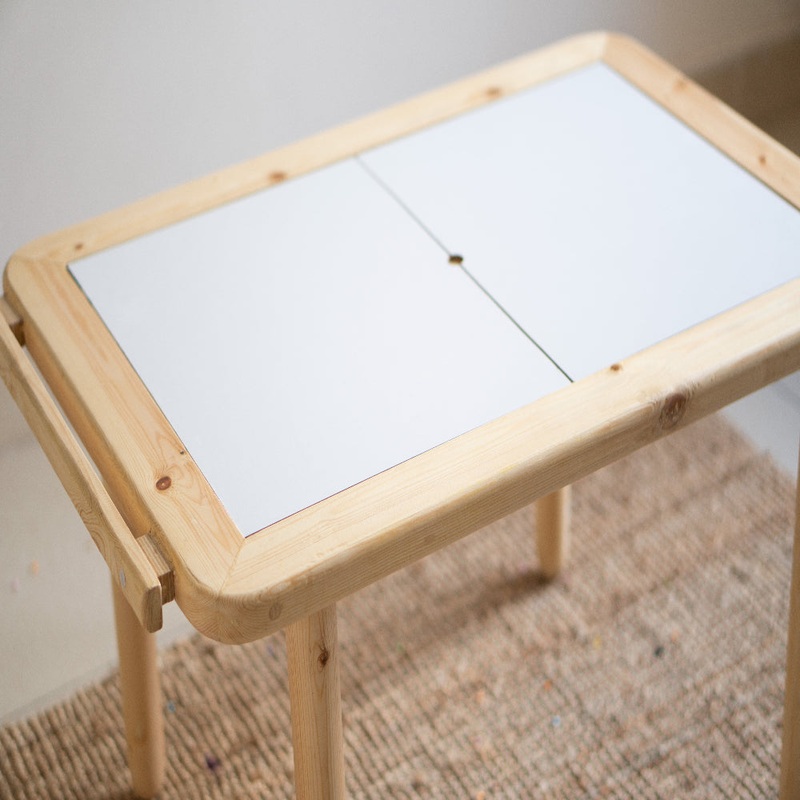 Our sensory table comes with two Ikea bins (or you can choose to buy it without them if you already have them at home), the white cover and the chalkboard (on the other side of the white cover). The materials in the pictures arenotincluded.. After use, it should be dried out with a towel to avoid damage. It is also not meant for outdoor use and sun exposure will damage the wood and void the warranty.