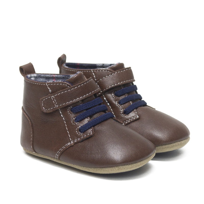 The Thiago First Kicks in Rust are introduced just in time for the colder months. Perfect for beginner walkers, Thiago is a classic brown leather baby shoe made with stretchy, faux laces, a velcro strap closure, and split rubber sole. In a nutshell, our Thiago is designed to stay on your baby’s feet and assist in gripping the floor as walking becomes more the norm. The plaid lining adds a touch of warmth, too.