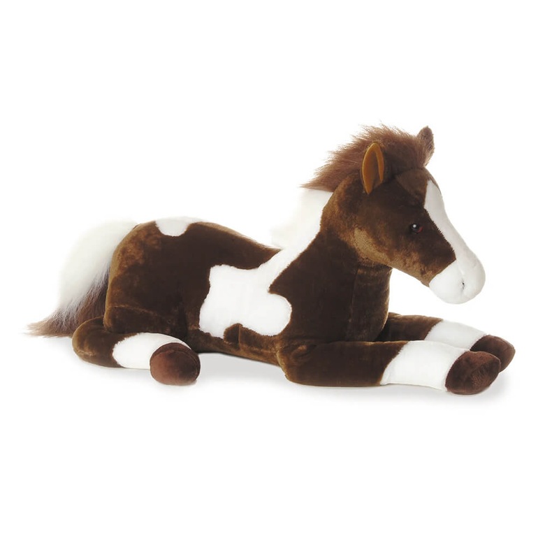 A beautiful chocolate brown stuffed horse is available in a super size now.High quality materials make for a soft, fluffy touchSuper Flopsies lay in a resting position for a realistic designSweet, lovable facial expressionSuitable for all agesSize: 27 inch