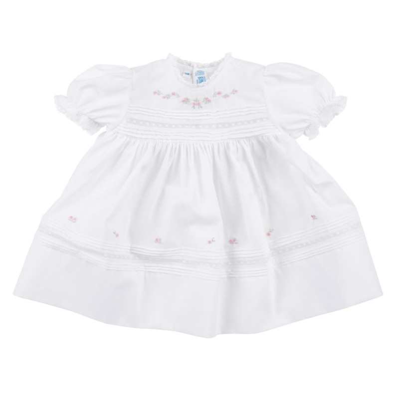 Looking for a beautiful vintage dress for your little girl? This exquisite piece has been a Feltman Brothers favorite for years!This vintage-style pieceis designed with lots of timeless details: fluted lace trim and inserts, tiny horizontal pintucks, and h