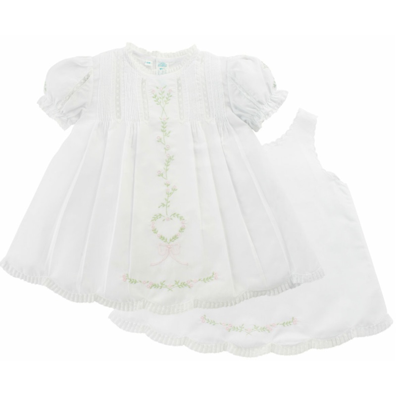 An exquisite, one of a kind slip dress that will make your little one look like the princess she is! Intricate floral heart embroidery in pink and green embellishes the front of the dress and the puffed sleeves in a design that will take your breath away.