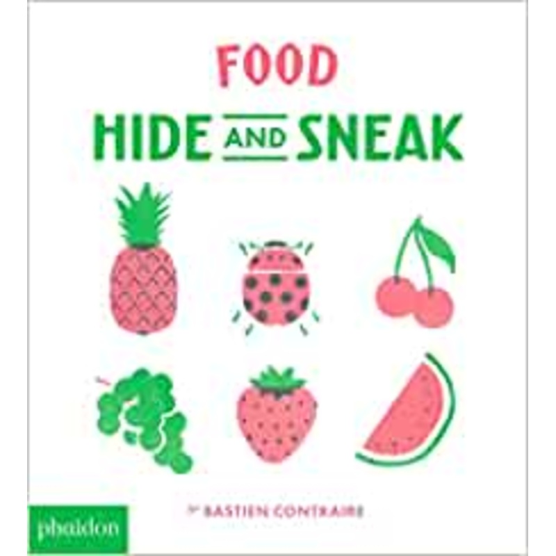 Behold this artful and unusual odd-one-out board book for the youngest readers, featuring a much-loved theme: food! Bastien Contraire masterfully creates spreads with six to eight images each – all of which belong together, except one that may resemble the others but has no business joining the rest. An umbrella among mushrooms, a snake among vegetables, and a canoe among pastries are all hiding in plain sight for the delighted toddler to giddily discover! Young readers will exercise skills of categorization and visual acuity in finding the “imposter”, and bask in the preposterous silliness. This is the third book in Contraire’s collectible Hide and Sneak series.