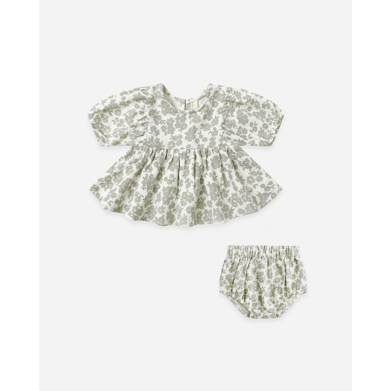 Our Francy Set features a sweet empire waist top with balloon sleeves and a back keyhole with a coconut button, paired with matching gathered bloomers for an effortlessly charming look.Featuring our 'green floral' print on our 'ivory' hue.Care: Machine was