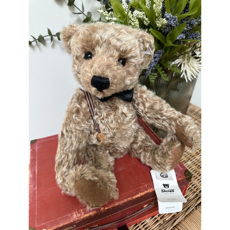 Frederic is the little brother of the larger Steiff Frederic from 2015 who is listed separately. This one is also made of caramel-tipped, high-quality mohair and is 5-way jointed, but measures just 34 cm tall. Frederic wears a bow tie, again made of formal velvet, and striped braces with smart wooden buttons. Just like his predecessor, he is also fitted with a beautiful growler. Get ready to welcome the second original Frederic with a charm all of his own!