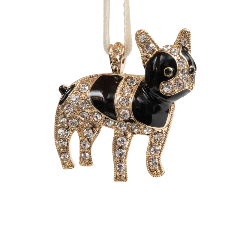 Inspired by her mothers flare for holiday decorating, Joanna Buchanan has turned her love of travel and knowledge gleaned from twenty years in fashion retail into an eclectic line of tabletop, barware, gifts, and decor. Decorous and whimsical,dangling from the tree or the mantle, the Frenchie Hanging Ornament enlivens any home for the holidays with its shimmering cheer.Packaged in an organza bag, its ideal for gifting, especially to a host with furry friends.