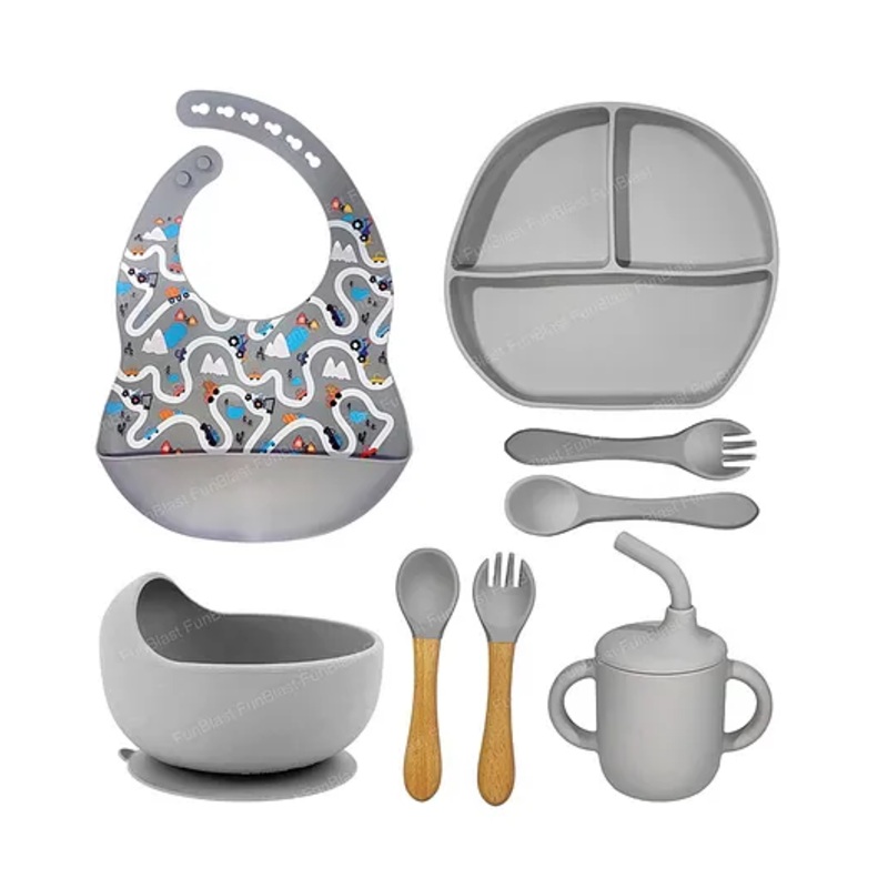 FunBlast Silicone Baby Tableware Feeding Set 8 Pcs Grey