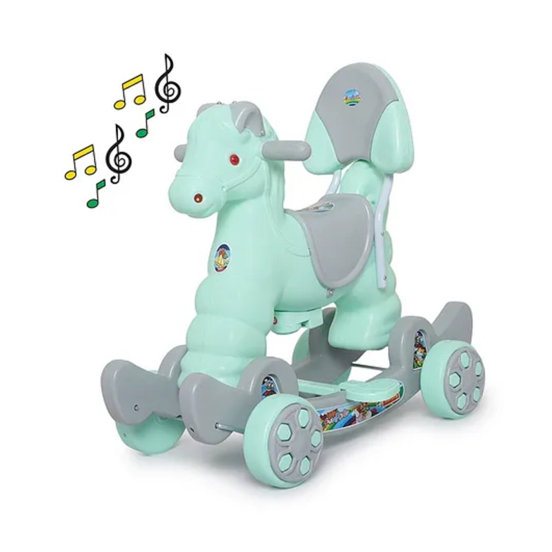 Music - Enchanting music to keep the baby entertainedSafety - Minimal rocker arc ensures that the children won't tip over by rockingLow Level Height - A low levelled stable rocking horse for young toddlersSecurity - Hand pegs and foot pegs provide a secure
