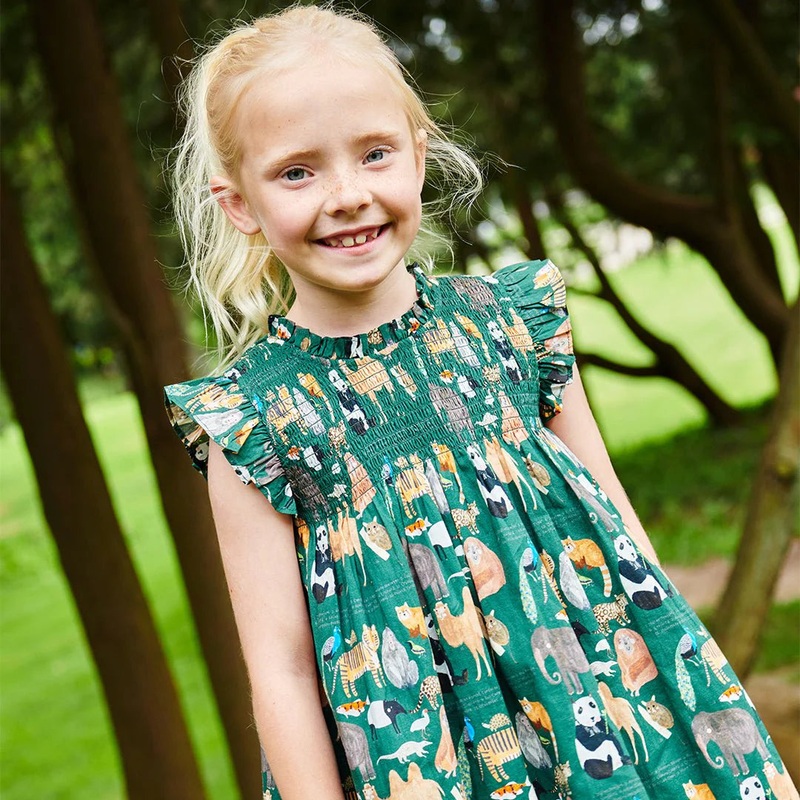 Artist Collab! Leave it to brilliant artist Darcie Olley to take us on an exotic adventure with our one-of-a-kind Animals of Asia print. Tigers, pandas, peacocks and more roam a forest green ground on our collection classic Girls Stevie Dress. This much lo
