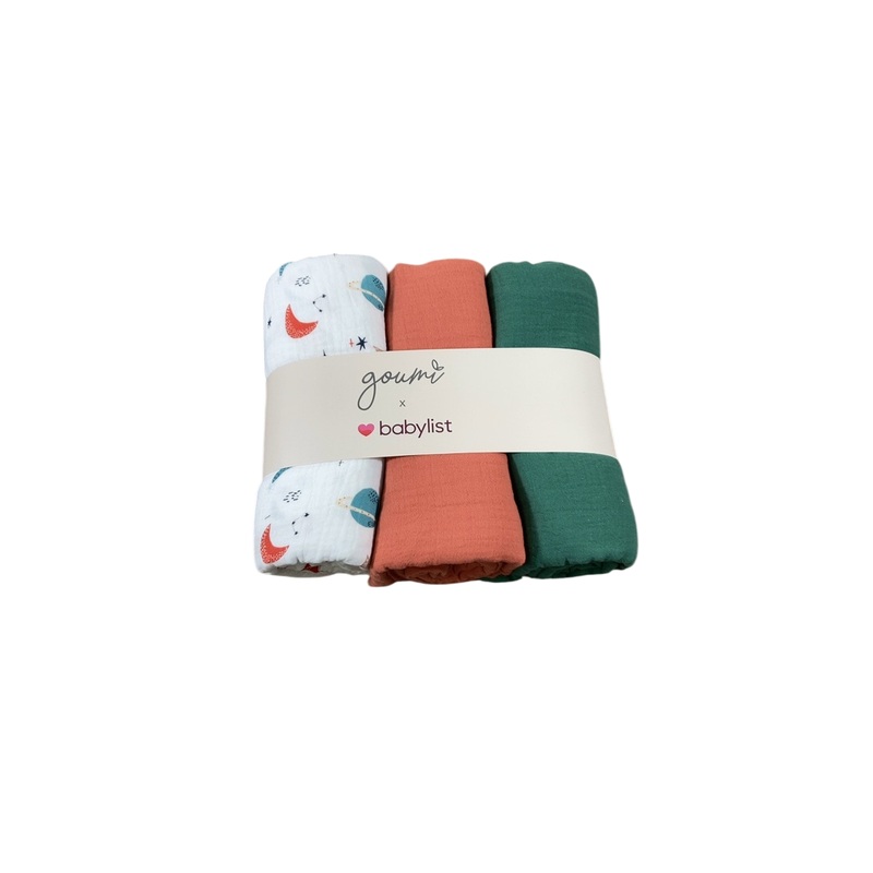 A set of soft and lightweight cotton muslin swaddle blankets with adorable patterns. Dimensions: each blanket 47 x 47.