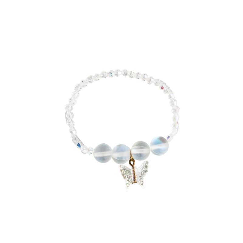 This is an epic combination of smooth iridescent glass beads and smaller faceted iridescent beads, paired with a fabulous glimmering iridescent butterfly charm. This bracelet is glowing and magnificent. Hold it up to the light to get the true rainbow effec