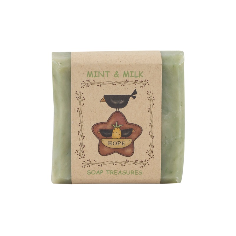 Soap that smells good enough to eat! This Mint & Milk bar soap from Soap Treasures is made from natural ingredients so it's a gentle treat for your skin. Contains essential oil.Handmade in York, PA. Ingredients: coconut oil, palm oil, shea butter, cocoa bu