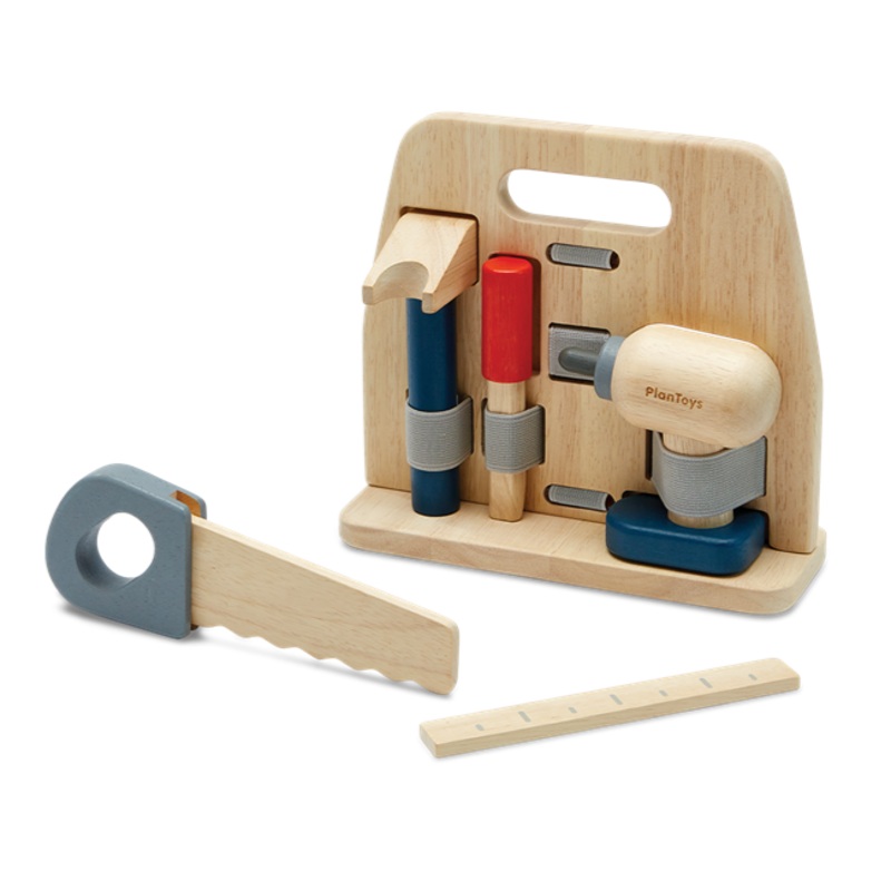 - The set comes with a open sided tool box, 1 drill, 1 ruler, 1 chisel, 1 hammer, and a hand saw