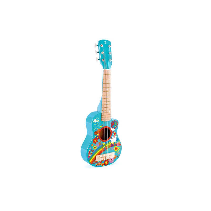 Be a real flower child with this cool 1960s-themed guitar! A cross between a classical guitar and a ukulele, its the perfect size for younger children wanting to learn an instrument. 1. Explore the sounds made by strumming each of the guitars six strings s