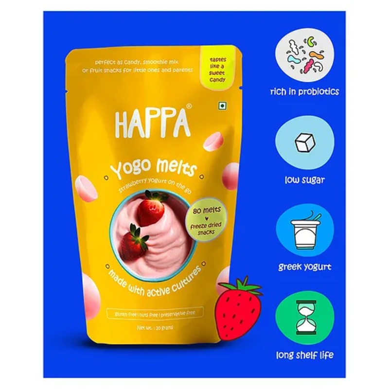 Product Description Happa Yogos Tiny bursts of goodness! Crafted from wholesome yogurt and fruit, Happa Yogos are specially designed yogurt drops that effortlessly melt in your little one’s mouth. These delightful treats offer tiny eaters and toddlers a delicious and wholesome snack that you can truly feel good about.