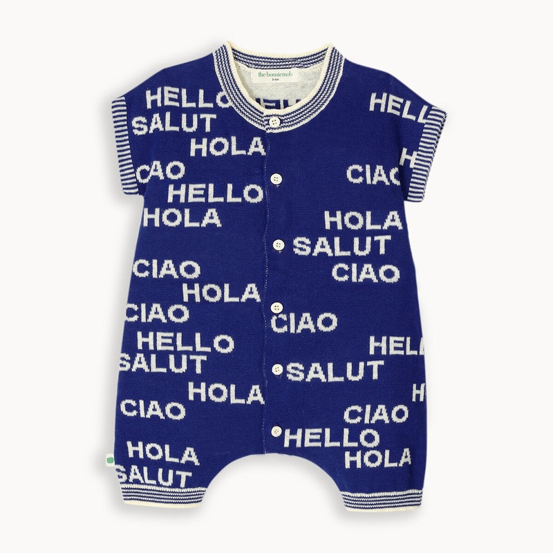 Hello! Ciao! Salut! What a way to greet the day. The Hello Shorty Blue Playsuit by The Bonnie Mob delights!Shorty knitted playsuit with Hello design in Navy/Cream. Soft ribbed cuffs and hem, round neck and tiny button front opening. Made from 100% super so