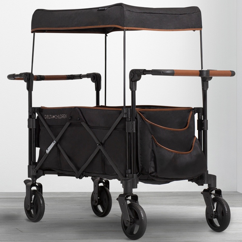 The Hercules Stroller Wagon by Delta Children is specifically designed to grow and flow with your family. Packed with more features than a standard double stroller, this convenient wagon is perfect for indoor or outdoor activities. A comfy option for siblings or friends, this stroller wagon features two cushioned seats with 3-point safety harnesses for security while the removable center console with two cup holders and storage pocket allows kids to share snacks, toys and drinks. An additional cup holder for parents and side pockets ensure you can bring everything you need along for the adventure. The removable, UV blocking canopy and roll-down shades offer privacy and protection from the sun or rain. Easy to drive, it features swivel front wheels that allow you to effortlessly turn and pivot, as well as push and pull handles with adjustable heights. The wagons compact fold makes it easy to store or transport. And when your children outgrow the need for a wagon, use it to haul your own gear at the farmers market, while gardening or the grocery store. Holds up to 110 lbs. (55 lbs. per seat). Weighs 36.3 lbs. Recommended for ages 9 months up to 55 lbs.