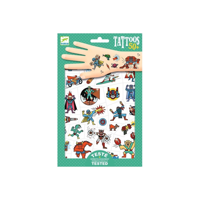Two sheets ofdermatologically tested temporary tattoos featuring superheroes and villains battling each other. These fun tattoos are designed with metallic finishing. Easy to use thanks to theirpre-cut design. Justapply with a little water.Remove with soap