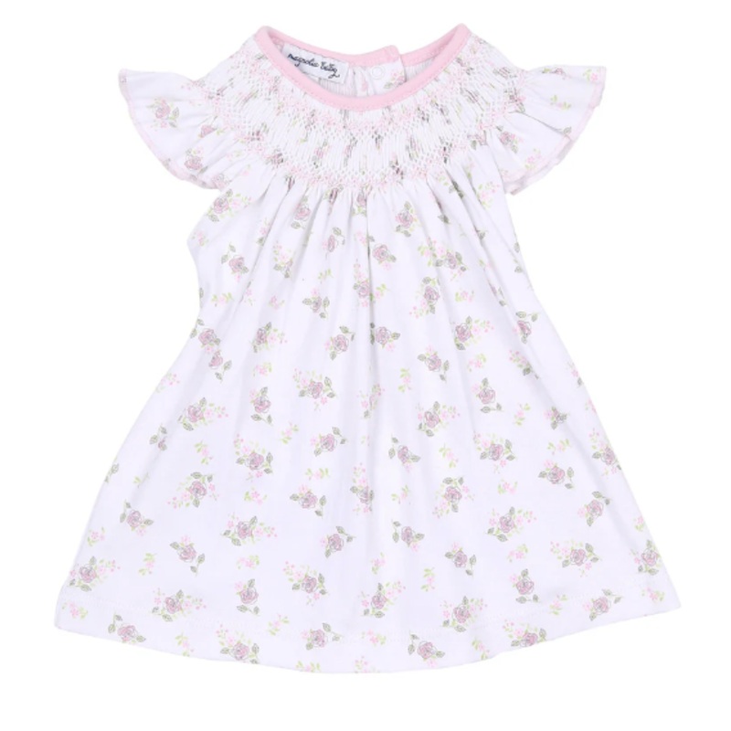 Hope's Rose Spring Bishop Dress Set with white bloomersBishop Smocked100% Pima CottonMade in PeruMachine Washable