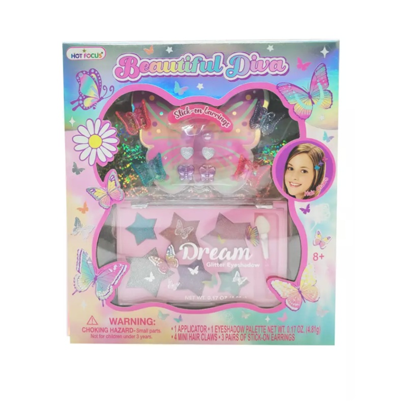 Hot Focus Beautiful Diva Tie Dye Butterfly Eyeshadow & Hair Claw Set includes one eyeshadow pallet, 4 mini hair claw and 3 pairs of stick-on earrings.