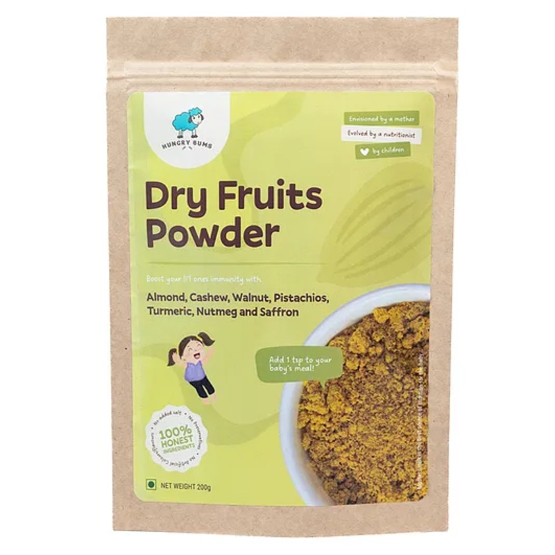 age – 6 months +quantity – pack of 1 – 200gm ProductDescriptionDry fruits powder is packed with the goodness of 7 nuts & superfoodsincluding almonds, cashews, walnuts, pistachios, turmeric, nutmeg &saffron. If you’re struggling with your baby’s low weight or just want yourbaby to have a stronger immunity & boost their nutrition, 1 tsp. of thepowder should be your go-to. It is great for brain development as well.