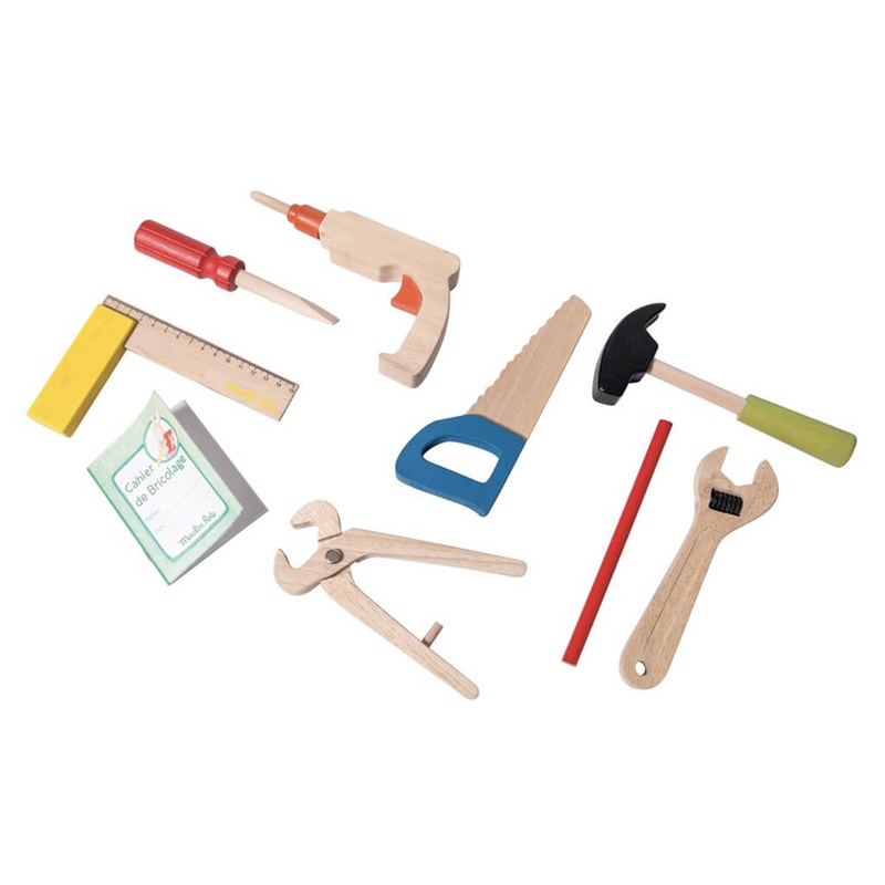 Let your little ones enjoy as they pretend to build projects while learning what each tool is meant to do. This set is packaged in a wooden carrying case illustrated with characters from La Grande Famille.Age: 3 years+Material: Solid woodSize: 11x8x2.5"