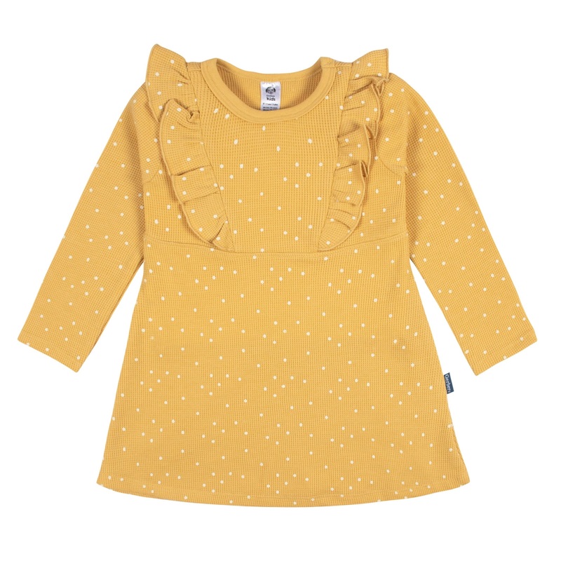 This long sleeve, yellow polka dot dress featuring adorable shoulder ruffles is the perfect addition to your baby girl or toddler girls wardrobe. Super soft and comfortable, this dress is made from a cotton and polyester blend to keep your little one happy