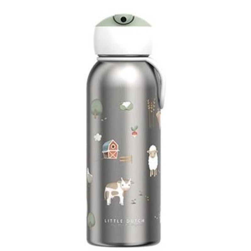 Hot or cold? The Mepal Little Farm double-walled stainless steel insulated bottle keeps your drink hot for up to 9 hours and cold for up to 12 hours. The bottle has a handy flip-up drinking system, allowing your child to easily push the drinking spout up and down. A straw is attached to the spout. We recommend using the bottle without the straw for carbonated drinks. A nice thing about the bottle is that it is very suitable for small children’s hands and is guaranteed leakproof. A handy loop is attached to the bottle, making it easy to carry. We recommend washing the bottle by hand and the cap could go in the dishwasher if desired.