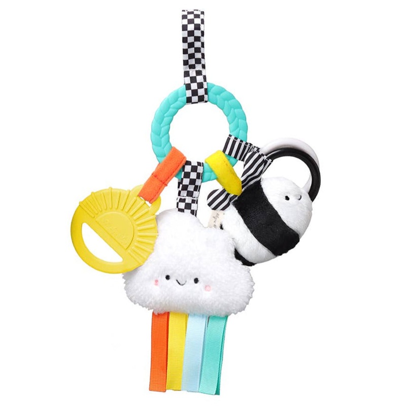Teethe, Play & Explore! A sensory sensation, our Bitzy Busy Ring has all the love in the details with multiple features for baby to explore. Textured teethers and dangling toys that jingle, crinkle and delight easily attach this toy to babys car seat or st
