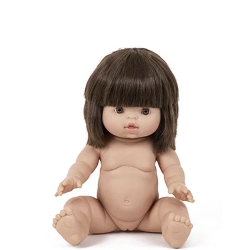 Jeanne ,baby doll.- 34cm or 13.5 inches- Hair styled with bangs- Brown eyes- All clothing is sold separately Vinyl doll and scented with vanilla.The materials used for their production are of high quality: from the raw material to the hair, to the eyes, to