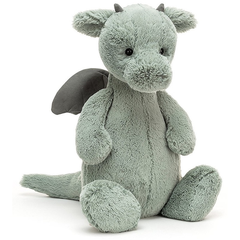 Bashful Dragon is a fierce little friend, with plenty of attitude! With supersoft fur in pale sage green, suedey horns and a long, squidgy tail, this brilliant beastie is pretty fantastic. We love those neat little contrast wings, chunky feet and fine flap