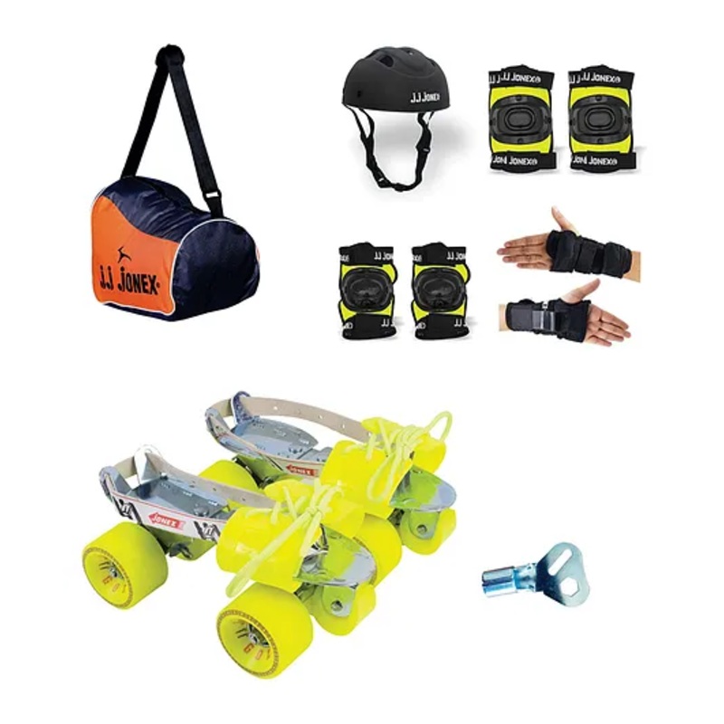 Jj Jonex Gold Adjustable Skates Combo PVC Helmet Knee Pad Elbow Pad Gloves Key Bag Medium Skating Kit- Multicolor