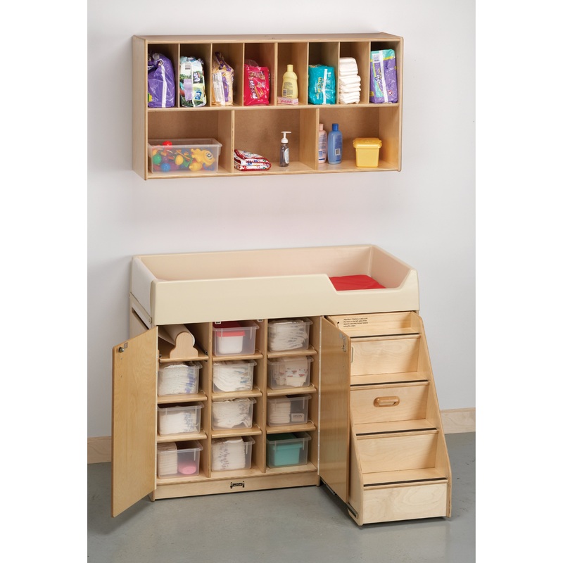 This sturdy changing table with a plastic top provides a safe surface that stands up to rigorous cleaning. Lockable, glide-out stairs on the left side of the unit has safety treads so little ones wont slip when climbing. Plus, extra deep rails exceed recom