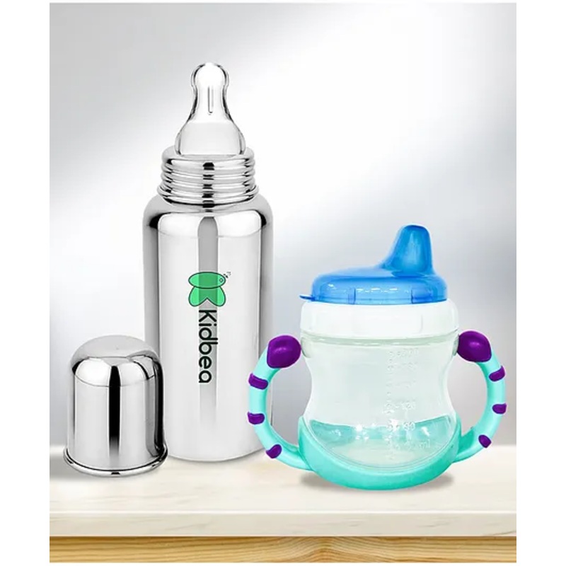 Kidbea Natural Baby Feeding Bottle, BPA-Free, Soft Nipple, Anti-Colic Design, 250 ml with Baby Feeding Sipper Cup Bottle | 200ml Wide Neck – Blue
