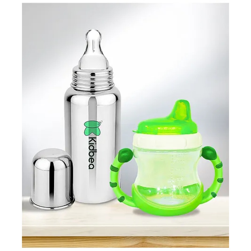 Kidbea Natural Baby Feeding Bottle, BPA-Free, Soft Nipple, Anti-Colic Design, 250 ml with Baby Feeding Sipper Cup Bottle | 200ml Wide Neck – Green