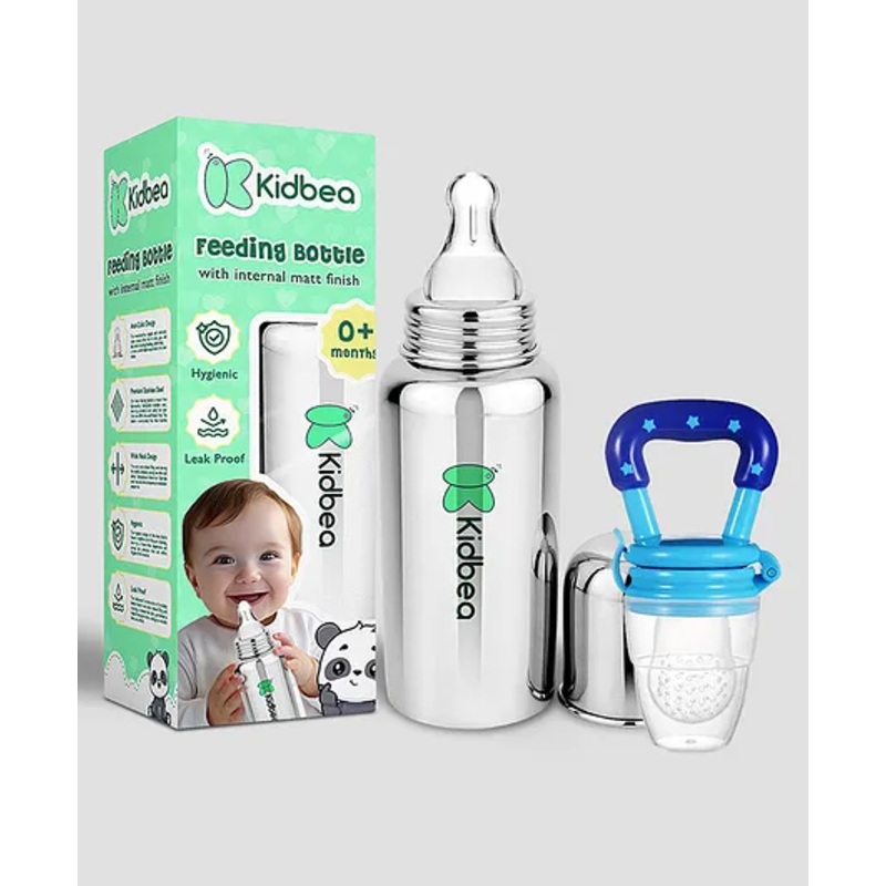 Stainless Steel Feeding Bottle Crafted from 304-grade stainless steel, plastic-free, and anti-colic.Silicone Food and Fruit Feeder BPA-free, safe, and ideal for introducing new foods to babies.Combo of 2 Complete feeding set including a feeding bottle, and