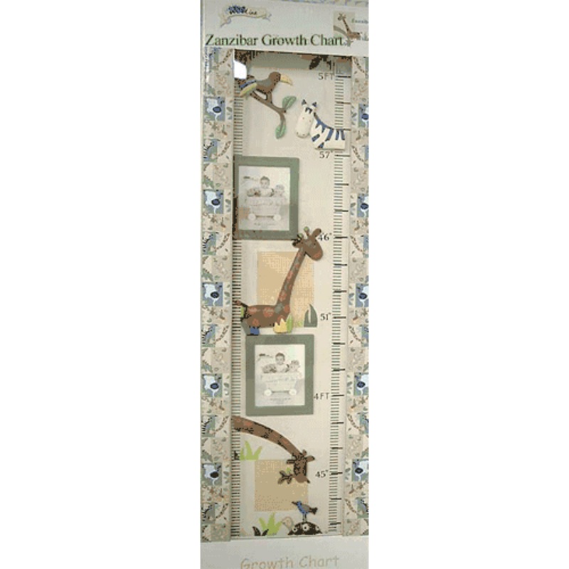 This item is unfortunately DISCONTINUED. The Zanzibar Growth Chart measures 5" x 40". It frames four 2" x 2.5" pictures, and measures your child from 23" to 5'.