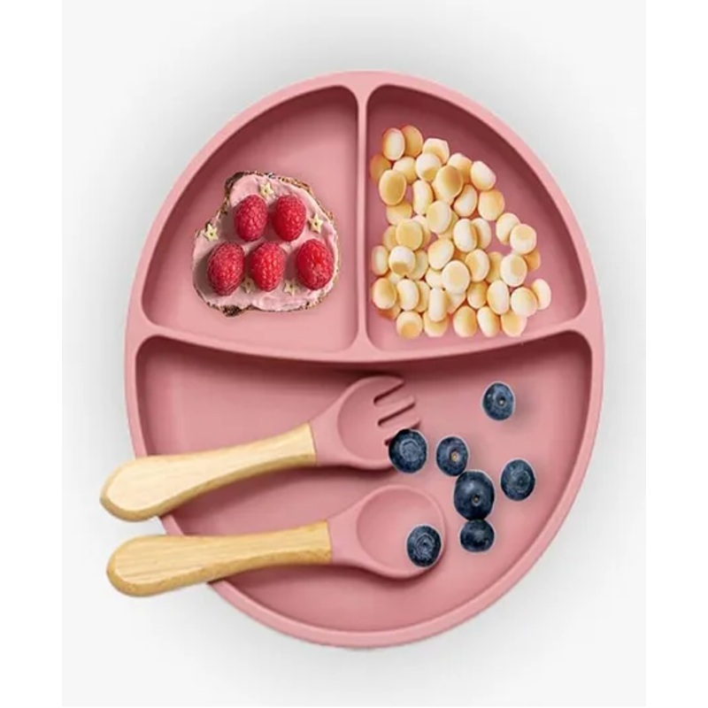 3-in-1 Feeding Set Plate, Spoon & ForkMade of 100% Food-Grade Silicone, BPA-Free & Non-ToxicStrong suction base prevents spills & messesMicrowave, Dishwasher, Oven & Freezer SafeSoft edges encourage safe self-feedingLightweight, durable & easy to cleanChar