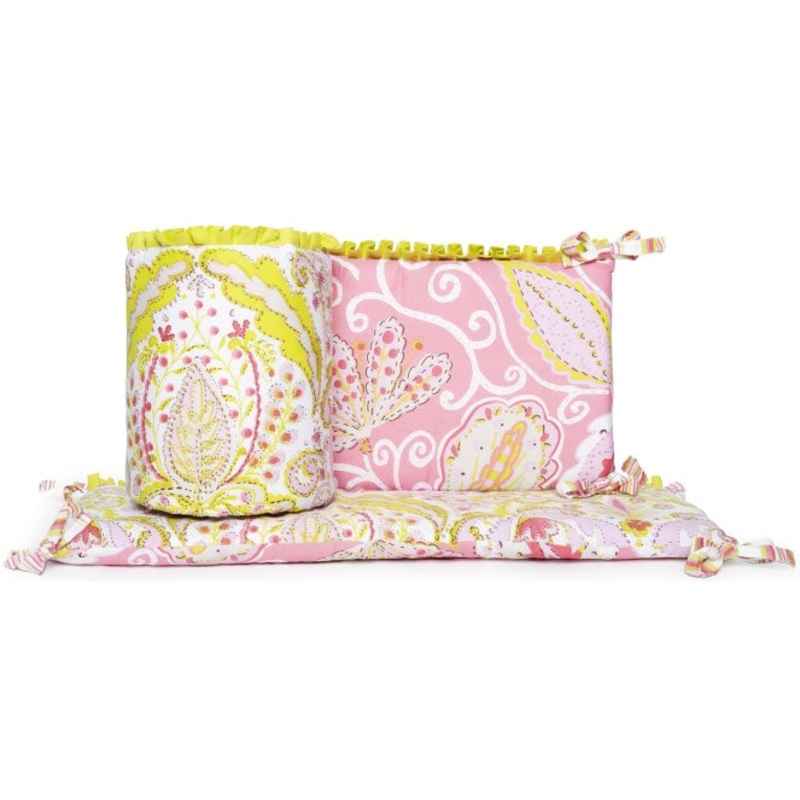The Dena Moroccan Garden Bumper is 10 inches high x 157 inches long. The long sides of the bumper are 10 inches high x 52 inches long with 4 sets of ties along the top and bottom. The smaller sides are 10 inches high x 26.5 inches long with ties on each corner.