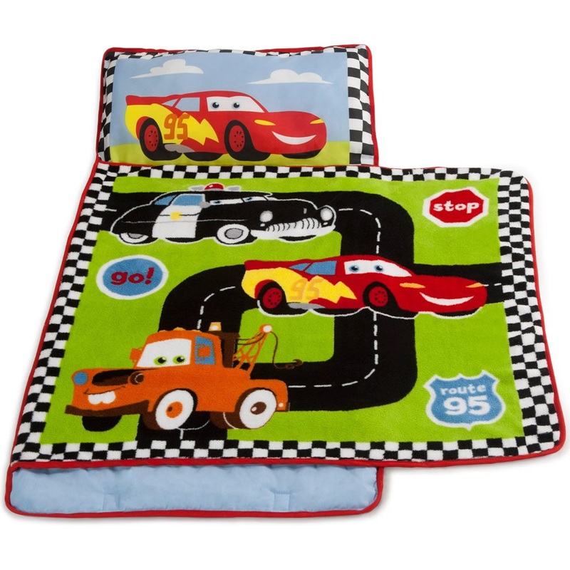 This all in one blanket and pillow Sleeptime Blanket is an adorable and comfy solution for your toddler. Featuring Lightening Mc Queen, Mater and Sheriff on route 95. Your child will sleep soundly while dreaming of racing around the track with all of their