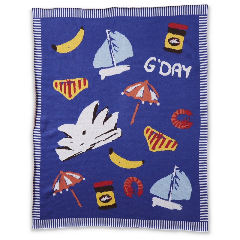 100% cotton knitIllustrated Aussie icons on a blue blanket with striped edgesFor the love of colour since 2012!Original prints, designed in Melbourne.90x100cm