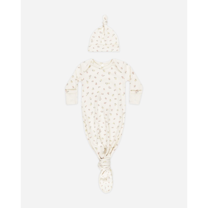 Knotted baby gown designed with fold over hand mitts, paired with our knotted baby hat in our stretchy rib knit.Featuring our 'fleur' print on our 'ivory' hue. Pastel pinks and yellows come together in this sweet floral look.Care: Machine wash cold. Tumble
