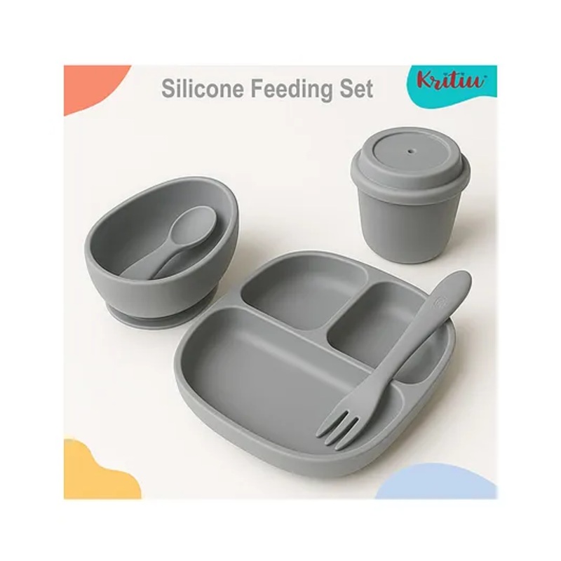 Kritiu 5 Pcs Silicone Baby Feeding Set, BPA Free & Microwave Safe Dinner Tableware Kit – Feeding Bowl, Suction Plate, Tumbler, Spoon & Fork for Kids, Toddler – Grey