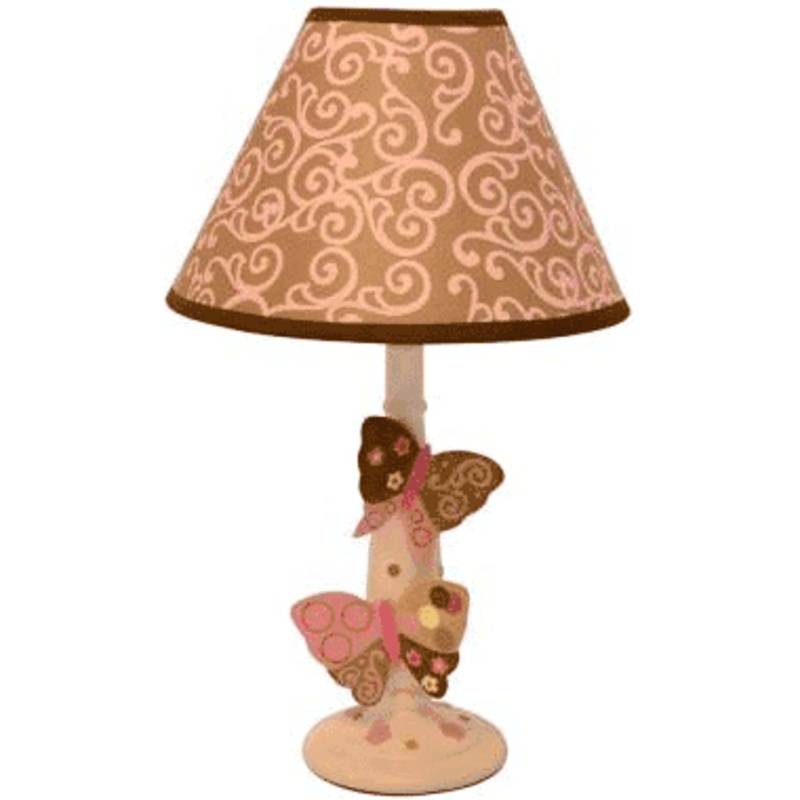 Butterfly Dreams Nursery Lamp by Lambs and Ivy. This sculpted lamp will add a decorative touch to your nursery. Features a wooden base with butterflies; along with a contemporary stylish shade with brown trim. Takes up to 40 watt, standard size bulb (not included). Has an on/off switch on light socket. Perfectly designed to coordinate with Butterfly Dreams bedding and accessories. Measures 10″ x 18″ high. Butterfly Dreams is a whimsical nursery bedding that will welcome home your new baby girl in style. Features a mix and match of contemporary prints and patterns featuring beautiful butterflies in high fashion colors like pink, brown, and camel; accented with a floral design.