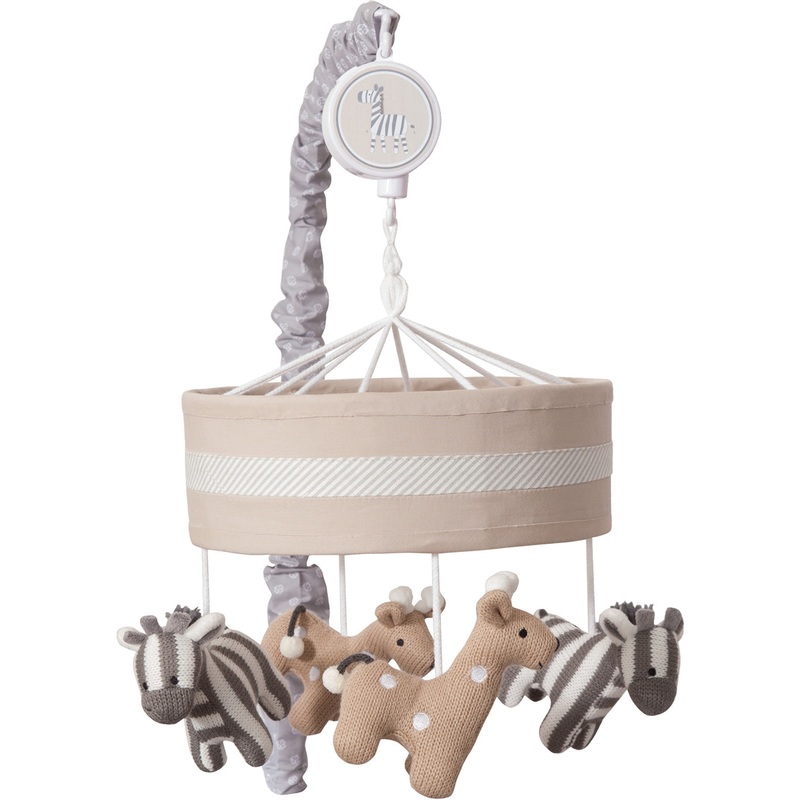 Our sweet little knit zebras twirl around the musical mobile under a wide banded canopy with a ticking stripe detail. Included is a gray geometric print cover for the mobile arm and safely fits all standard and most convertible cribs. An optional wall moun