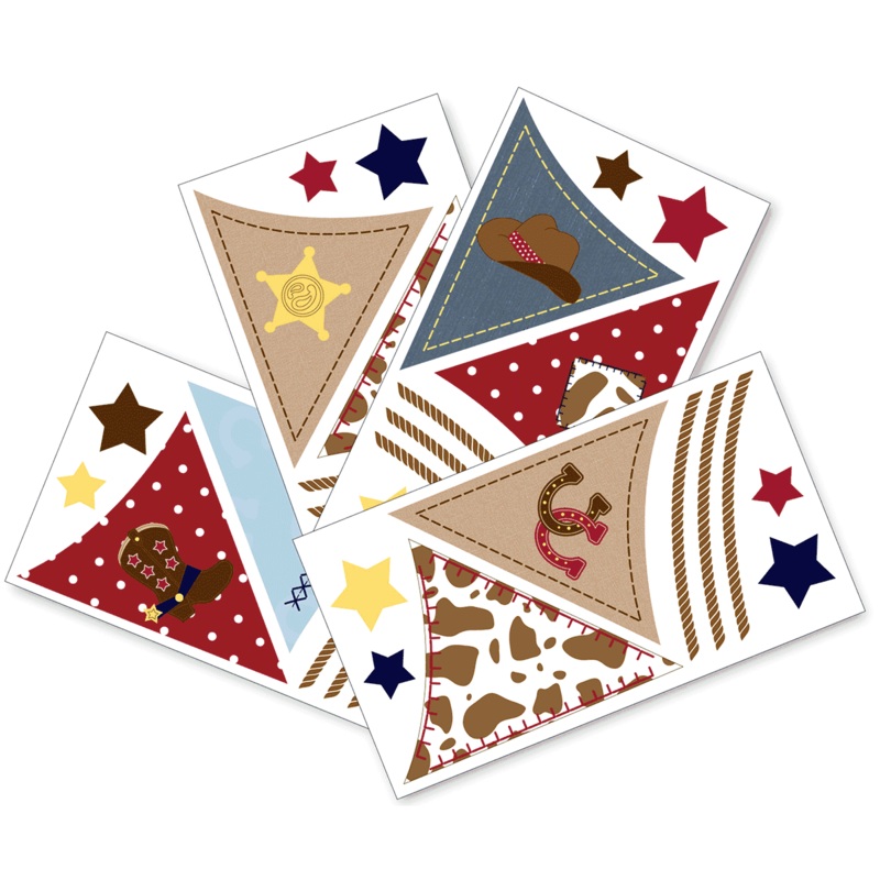 The Giddy Up Wall Appliques contains four 10 inch x 18 inch sheets of various sized stickers. There are 36 stickers in all. They have self-stick adhesive that won't harm walls. The decals are removable and reusable. Just peel and stick.