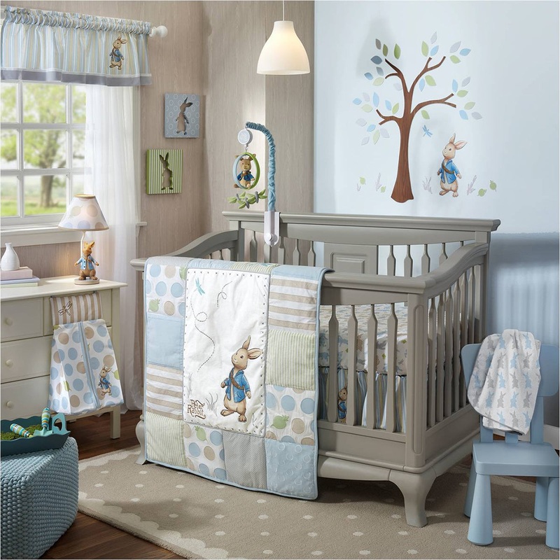 The Peter Rabbit? 4 Piece Baby Crib Bedding Set includes comforter, dust ruffle, fitted sheet and diaper stacker. The bumper is sold separately. The comforter measures 35 inches x 44 inches. The dust ruffle has a 14.5 inch drop, and the fitted sheet is designed to fit a standard size 28 inch x 52 inch crib mattress. The diaper stacker is 20.5 inches x 11.5 inches, and is 8 inches deep. It hangs from ties in the top corners. The set is made of a mixture of cotton blend fabrics including polyester. The dust ruffle platform is 100% olefin. Filling is 100% polyester fiber. Fabric content is exclusive of decoration. Care instructions: machine wash cold with like colors in gentle cycle, do NOT bleach, tumble dry low, and iron on lowest setting as needed.Peter Rabbit?.