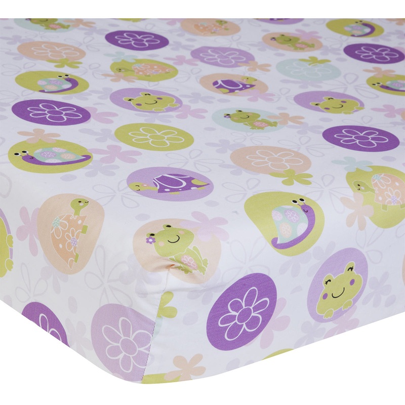 Fill your little one’s bedroom or nursery with soft pastels and friendly creatures; a pond is home to a sweet bunch of frogs, a snail, and turtles. The different textures and patterns incorporated into the Puddles collection by Lambs and Ivy attests to the attentive and thoughtful craftsmanship that goes into the creation of these pieces. The featured Sheet has elastic bands that ensure a snug fit over your crib mattress; no matter how much your child may toss and turn each night, it’s sure to stay in place. Supremely soft cotton fibers make this fitted sheet comfortable for your little one, and will put you at ease and worry-free. Colorful patterns and happy frogs will keep your child company whether she is at play or in deep slumber. Pair with other items from this collection by Lambs and Ivy to complete a fun look for your child’s bedroom.