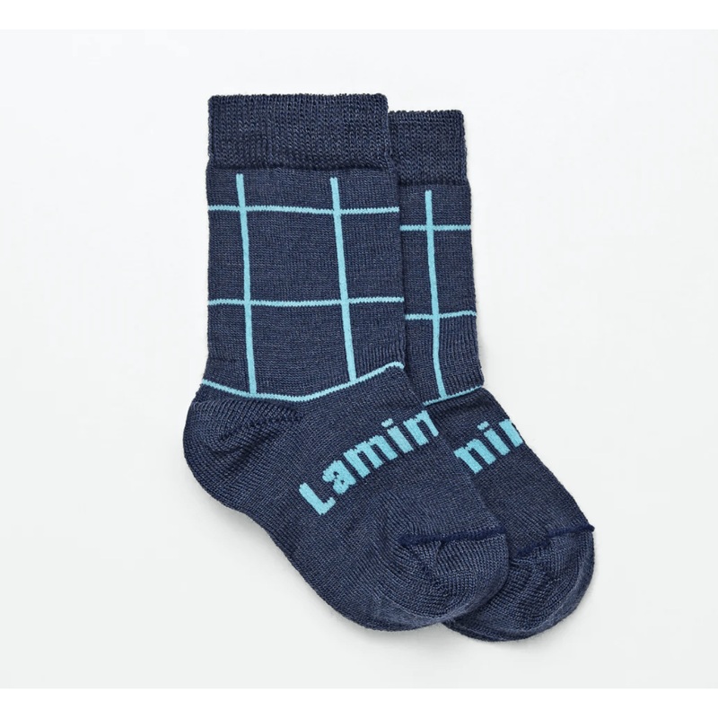 Polar-Dark blue with a light blue grid pattern merino wool crew socks for babiesAlso available in LamingtonChild,Woman+ManNew Zealand Made, 70% Merino wool, sizes knitted into every pair so no confusion over whose are whose!Colours may vary slightly to pho