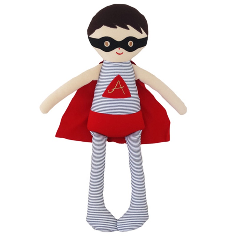 The Alimrose Super Hero Doll can and will save the day. Easy for little hands to hold, he encourages imaginative play, vocabulary development and hand-eye coordination.Key features:Cotton outer with all new poly fiber fillCool red cape and maskSoft and cud