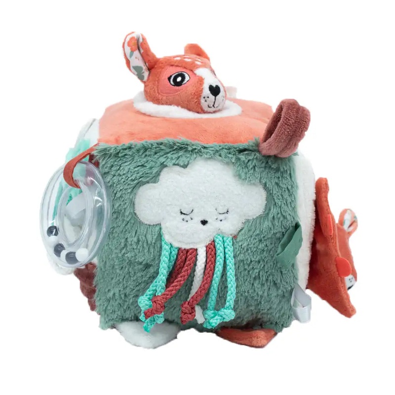 This large activity cube is has all the things a baby loves! Different textures, a shiny mirror, a teether and all the things a baby needs to stimulate their sensory intelligence and imagination!